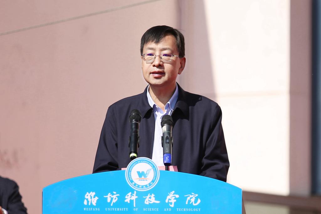 魏华中在致辞中代表学校向运动会的顺利开幕表示祝贺!向筹备组织运动会的师生表示衷心的感谢!向运动会裁判员、运动员致以美好的祝愿!他指出,作为落实立德树人根本任务的关键环节,学校体育教育不仅是提升学生综合素质的根基,更是培育时代新人的重要阵地。作为新时代的青年学子,肩负着实现中华民族伟大复兴的历史使命,而高尚品德、渊博学识、创新精神和实践能力的培养,都离不开强健体魄这一坚实根基。希望全体运动员以此次运动会为契机,大力弘扬顽强拼搏、团结协作的体育精神,将体育锻炼融入日常生活,让强健体魄成为终身财富。在运动中享受乐趣、增强体质、健全人格、锤炼意志,以昂扬向上的姿态,展现出新时代潍科人勇立潮头、锐意进取的卓越风采。他着重强调,运动会不仅是对学校体育教育成果的全面检验,更是全校师生精神风貌与综合素养的集中展现。体育精神,不仅在于对竞技成绩的卓越追求,更在于敬畏规则、尊重对手、团结协作。希望全体运动员坚持“安全第一、友谊第一”的原则,在赛场上挑战自我、突破极限,赛出成绩、赛出水平、赛出风格。