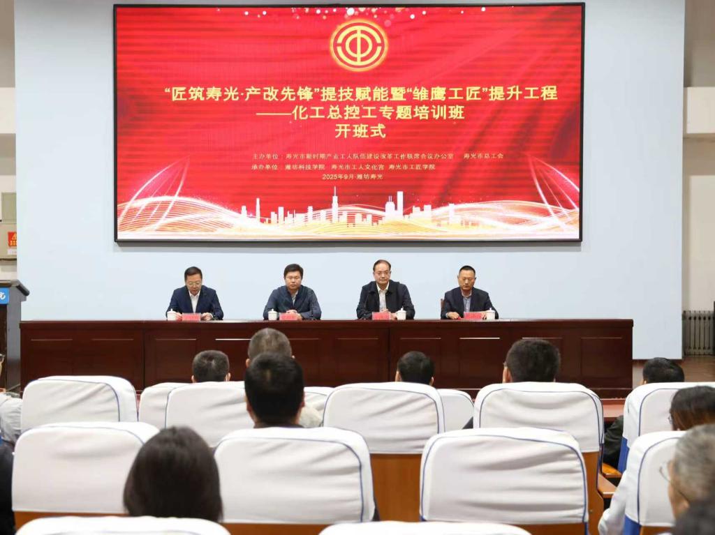 9月23日,“匠筑寿光·产改先锋”提技赋能暨“雏鹰工匠”提升工程——化工总控工专题培训班开班仪式在寿光市工匠学院举办。此次培训由寿光市新时期产业工人队伍建设改革工作联席会议办公室、寿光市总工会主办,潍坊科技学院、寿光市工人文化宫、寿光市工匠学院承办。寿光市总工会党组书记桑迎彬,寿光市总工会党组成员、副主席王建华,我校党委书记王洪禹,我校校务委员会委员、工会主席杨洛滨出席。各镇(街区)总工会副主席,寿光市化工企业生产一线80名产业工人参加。