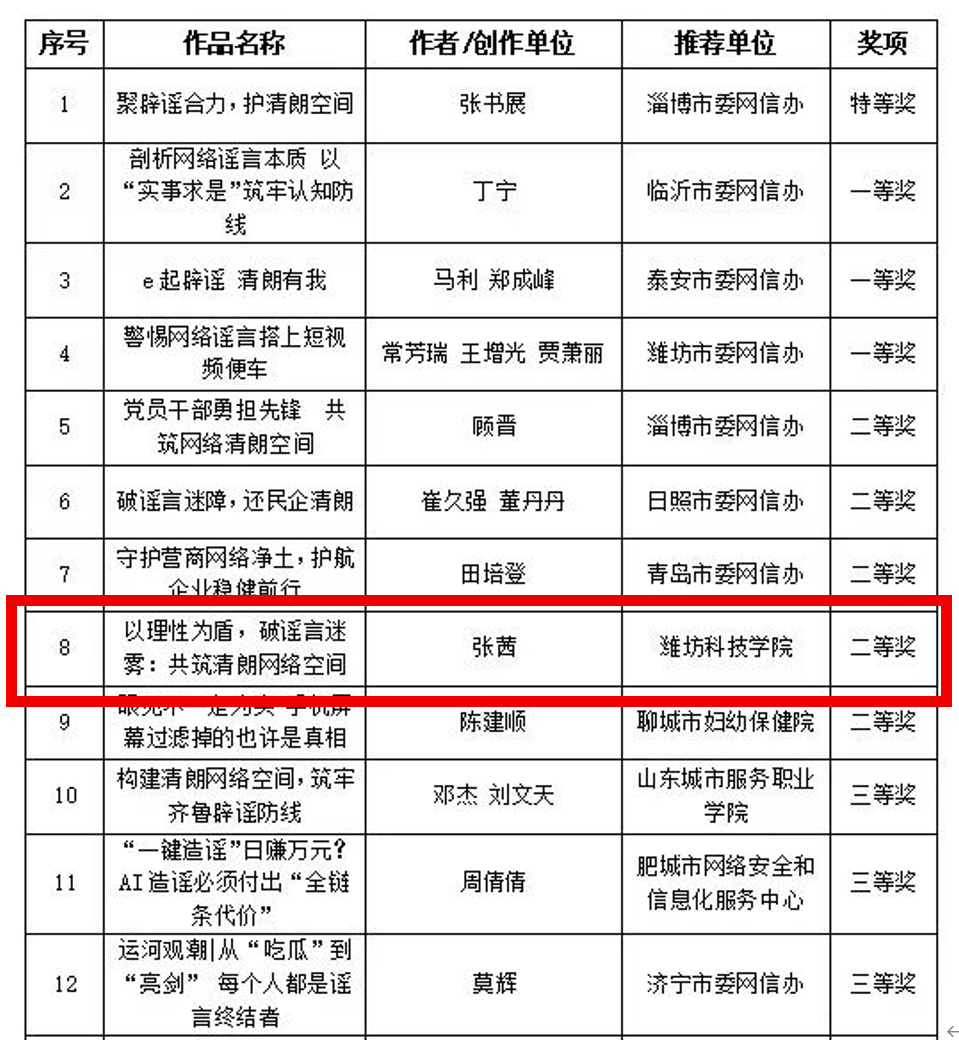 12月26日,由中央网信办违法和不良信息举报中心指导,山东省委网信办主办,山东省互联网违法和不良信息举报中心、潍坊市委网信办联合承办的2025年度山东省互联网辟谣优秀作品发布会在潍坊成功举办。土木工程学院学子张茜创作的作品《以理性为盾,破谣言迷雾:共筑清朗网络空间》荣获文章类二等奖,展现了青年学子在网络空间治理中的责任担当。