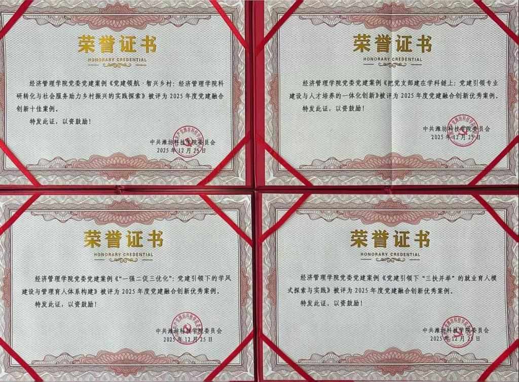 近日,学校发布了党建融合创新十佳案例评选结果,经济管理学院党委申报的四项党建融合创新案例成功入选,其中《党建领航·智兴乡村:经济管理学院科研转化与社会服务助力乡村振兴的实践探索》案例成功入选党建融合创新十佳案例;《把党支部建在学科链上:党建引领专业建设与人才培养的一体化创新》《“一强二促三优化”:党建引领下的学风建设与管理育人体系构建》《党建引领下“三扶并举”的就业育人模式探索与实践》三项案例同步获评党建融合创新优秀案例,这是学院党委深耕党建与业务融合创新的重要成果,彰显了学院以高质量党建引领高质量发展取得显著成效。